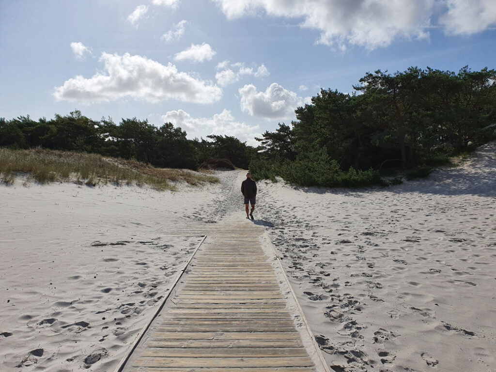 Fra parkeringspladsen ved Dueodde strand, gik en smuk sti ad en trækonstruktion ned mod stranden. Flotte omgivelser, men vi var glade for, at vi ikke var der i højsæsonen. Da vi ankom var der et par biler på parkeringspladsen, men da vi skulle derfra igen (omkring kl 10), var der fyldt – og ligeledes 3 store busser – hvordan ser det så ikke ud i den travle ende af højsæsonen?