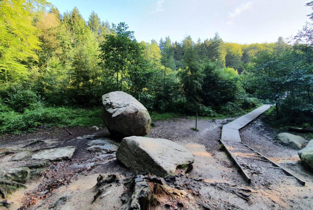 Fra parkeringspladsen ved Bornholms Kunstmuseum, går der en sti der fører rundt forbi de forskellige klippeformationer ved Helligdomsklipperne. Flere af stederne kan du gå ned. Men hvis du kun skal ned et af stederne, vil jeg anbefale ”Den sorte gryde”….. hvis du tør! Efter sigende lever der en giftig edderkop (svarer til styrken af et hvepse-stik) inde i den 60 meter lange hule.