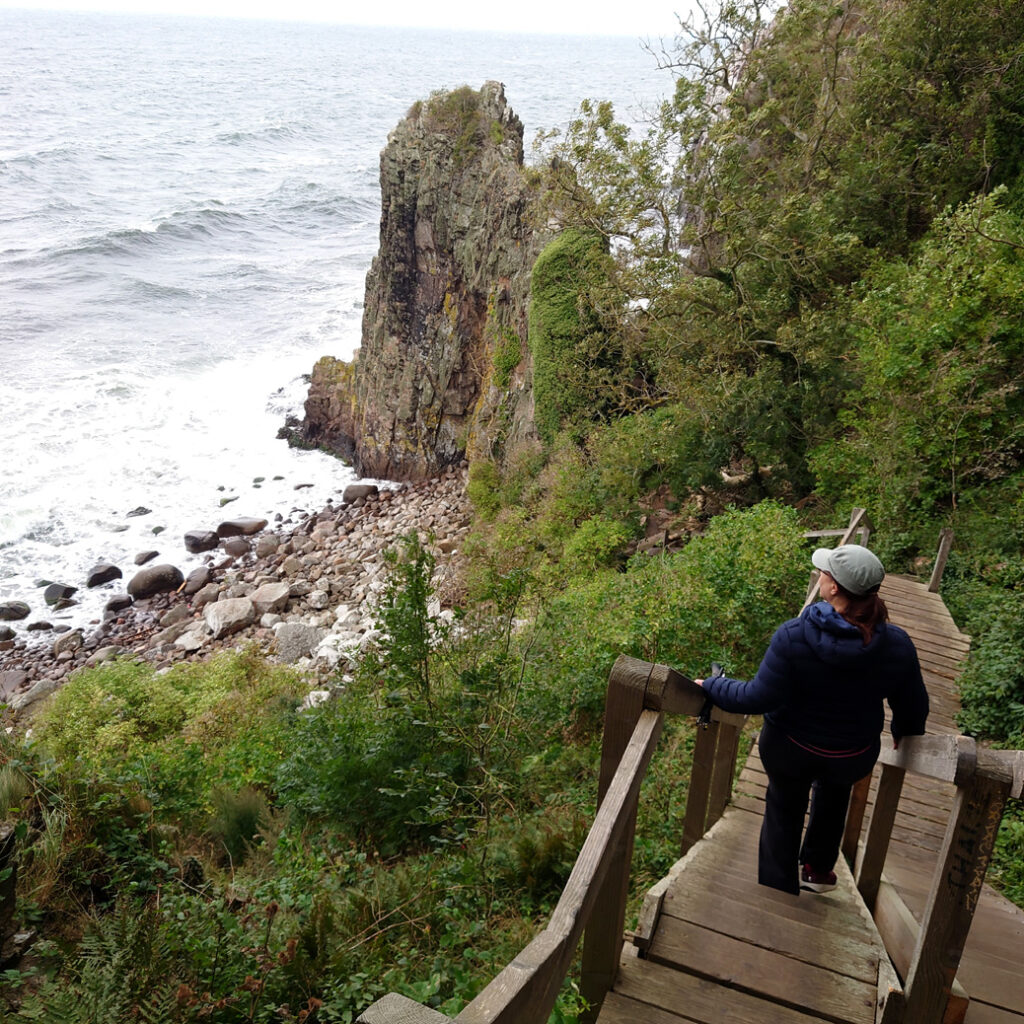 Man får god motion når man vandrer på Bornholm. Turen til Jons Kapel er ingen undtagelse. En smuk udsigt, brusende bølger der blev kastet imod de høje klippevægge og en god træningstur op og ned af de 108 trappetrin. Ikke alene turen ad trapperne, men også vandringen i klipperne er en udfordring. Men jeg vil anbefale at man udforsker området når man først er kommet ned til ”kapellet”. Vi fandt desværre først ud af efter vores tur dertil, at der findes flere huler man kan udforske end den ene vi fandt. Det kræver et godt fodfæste når man går rundt i klipperne.