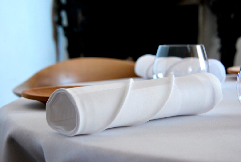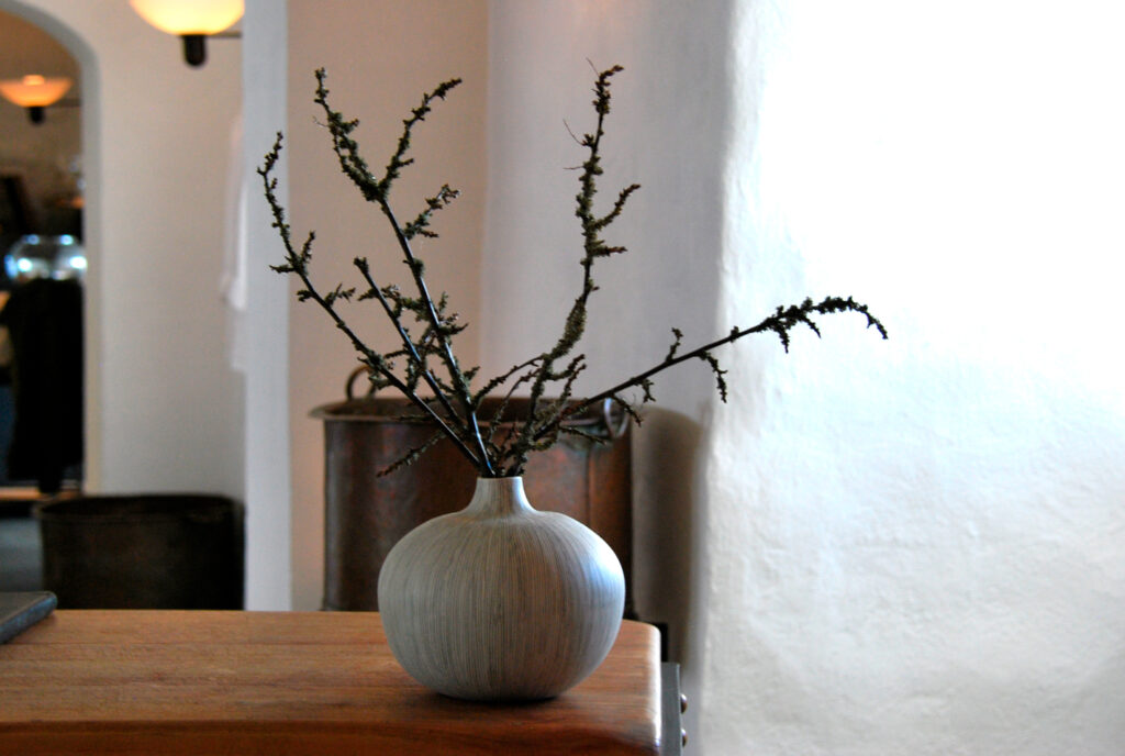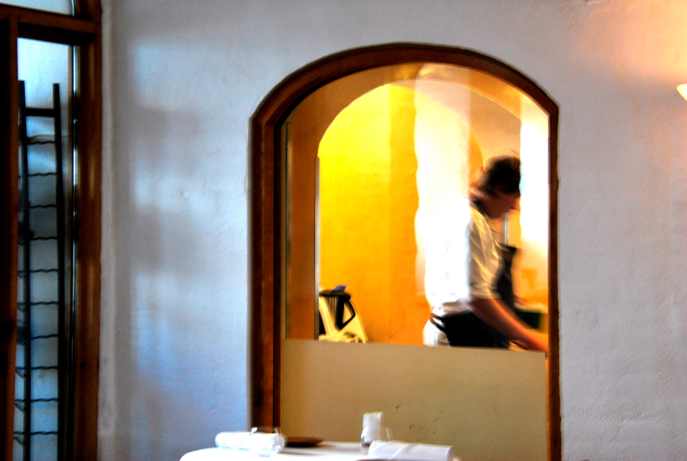 Der var god atmosfære lige fra starten. Bordene er meget spartansk dækket – minimalistisk – med tydelig idé om at der er fokus på den enkelte servering, og ingen lange rækker af bestik der konstant henleder opmærksomheden på næste ret.