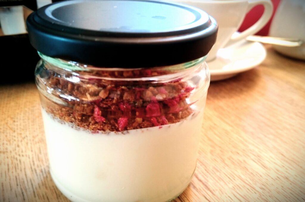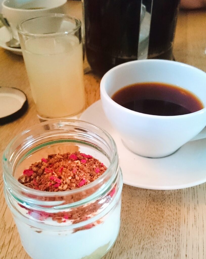 I Spisehuset var der servering af morgenmad. Selv denne oplevelse var noget anderledes end det jeg ellers har prøvet. Ved bordet blev stillet en lille brun papirspose med hjemmebagt morgenbrød, og diverse skåle med nyrørt smør og hjemmelavet smørepålæg. Vi fik alle et glas med æblekompot, yoghurt og hjemmelavet knas på toppen.