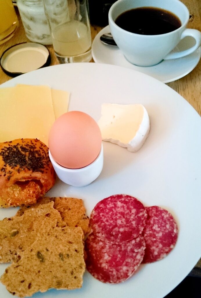 Dernæst kom en tallerken til hver med diverse oste, hjortespegepølse, blødkogt æg, hjemmelavet knækbrød og en lille grovbirkes med remonce. Derudover en rigelig strøm af nystemplet kaffe og presset æblemost.