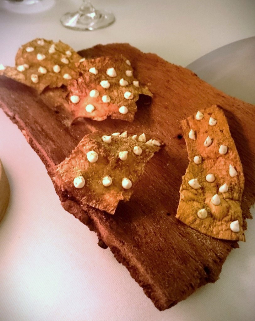 Vi havde bestilt 7 retters menu med vinmenu. Men ved velkomst og præsentationen af menuen, blev vi allerede overvældet af nyheden om, at der ville være 6 forskellige snacks inden selve middagen gik i gang.