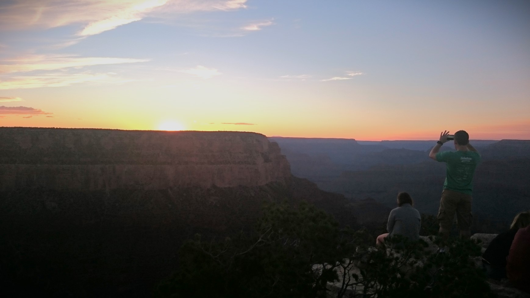 På vores første tur, boede vi på en stor campingplads i byen Tusayan. Herfra kan man tage shuttlebusser til Grand Canyon. Efter vores dagsture med vandring, gennede vores guide os alle ind i turbussen, og bestille en god portion familiepizza og masser af cola. Derefter blev vi, sammen med pizzaerne, transporteret til Yavapai Point.