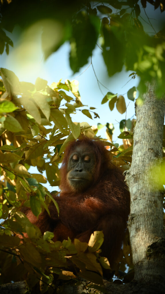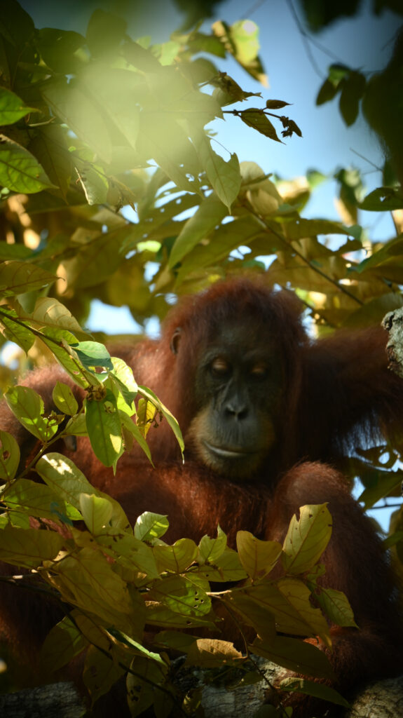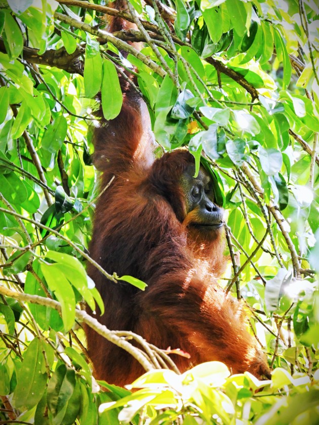 Der går en times tid inden vi når til et sted hvor en anden hun, bevæger sig med lethed imellem træernes skjul. Jeg kigger som om jeg er fastfrosset i dette øjeblik, for jeg vil ikke have at det skal ende. Jeg er som fortryllet af de gyldne skovmennesker. Hjertet slår kolbøtter i takt med at orangutangen akrobatisk søger videre på sin færd. Hun kommer utroligt tæt på- lige imod mig, og drejer af til et andet spor.
