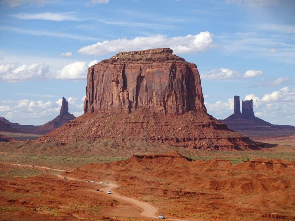 Navajo Nation har selvstyre med egne love og regler, og alkohol er absolut forbudt, så vores bus skulle tømmes inden vi kørte ind i området – ellers kunne vi risikere at blive sendt ud igen. Allerede på vej imod Monument Valley, bliver man imødekommet af et storslået panorama over de velkendte klippeformationer. Velkendte, fordi jeg har set dem i utallige westerns – og for øvrigt også i filmen ”Forest Gump”. på vejen derhen er der et udsigtspunkt der hedder “Forest Gump Point”.